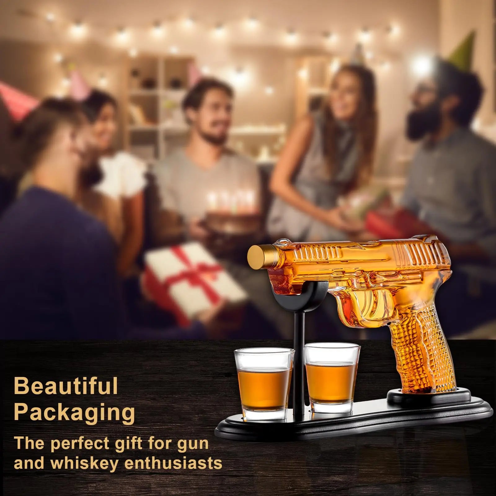 This handcrafted gun-shaped whiskey decanter set is designed to combine bold visual impact with refined glass craftsmanship. Made from high-quality lead-free glass, it serves as a striking centerpiece for any home bar while offering practical storage for your favourite spirits.