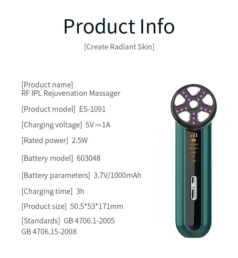 - Working Principles: ION+, ION−, EMS, RF, LED, Warm, Vibration Massage