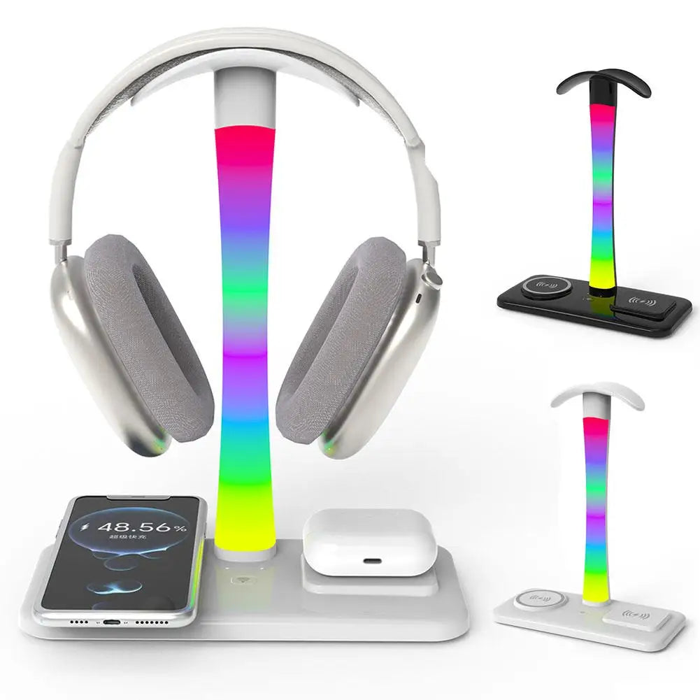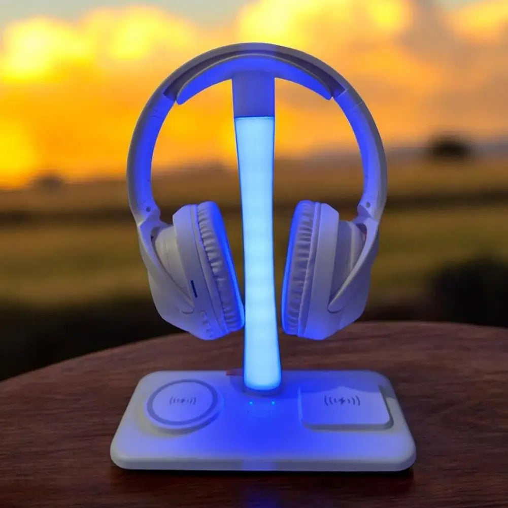 This Multifunction Wireless Charging Headphone Stand combines a sturdy headphone holder with wireless charging for both your smartphone and Bluetooth earbuds. Designed for modern desks, it keeps your workspace organised while adding a stylish RGB ambient light effect.