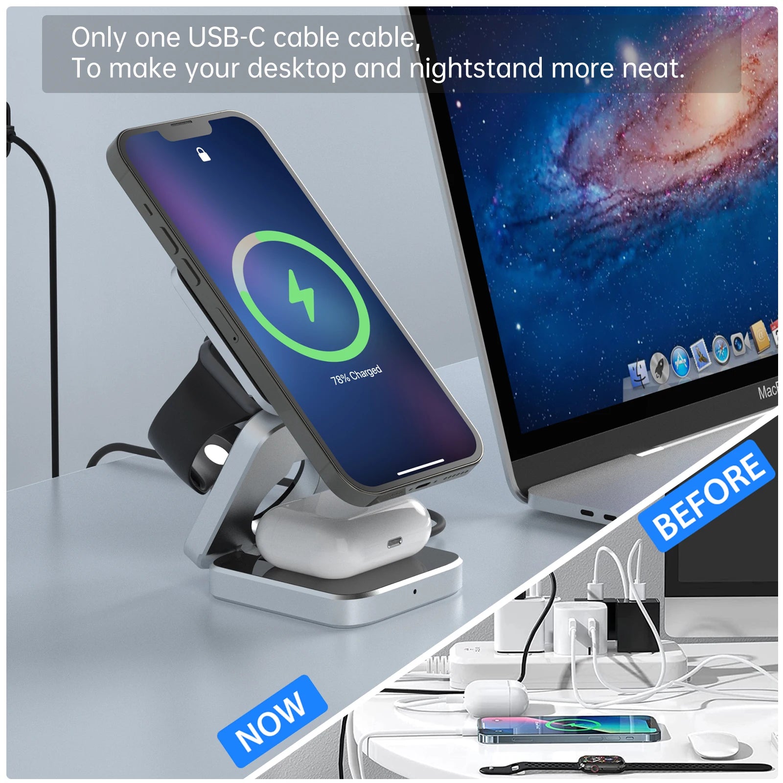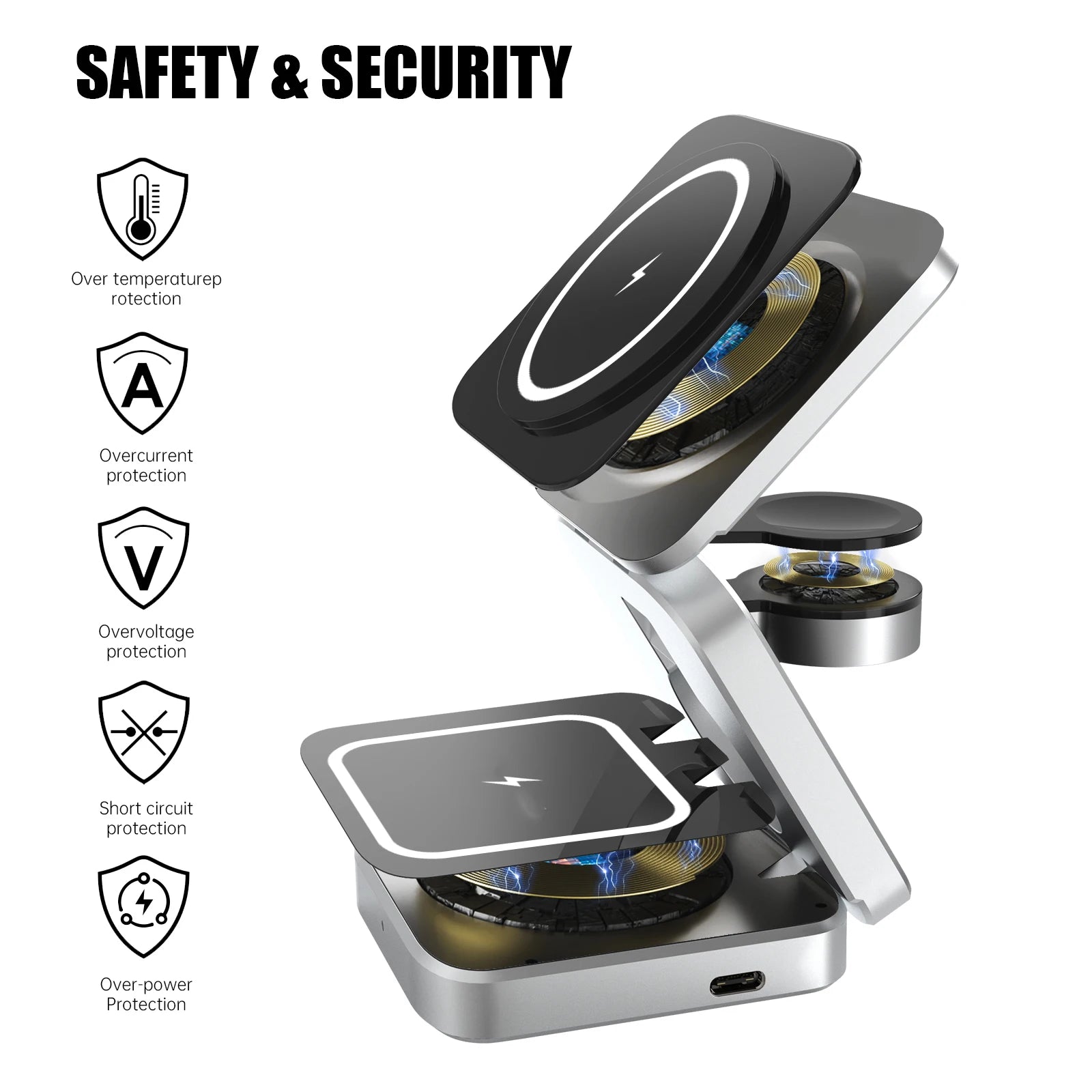 The VBNM PB11 Portable 3-in-1 Foldable Magnetic Wireless Charger is a compact, travel-friendly charging solution designed to power your smartphone, smartwatch, and wireless earphones simultaneously. Featuring fast Qi wireless charging, strong magnetic alignment, and a foldable stand design, it keeps your devices organised and charged at home, at work, or on the go.